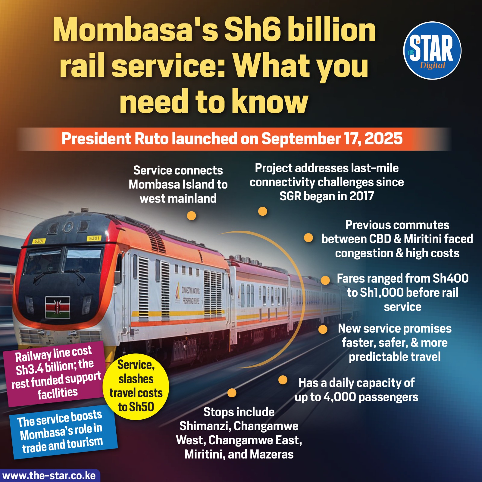 On September 17, 2025, President Ruto inaugurated the new Mombasa rail service, a Sh6 billion project designed to enhance connectivity between Mombasa Island and the west mainland.