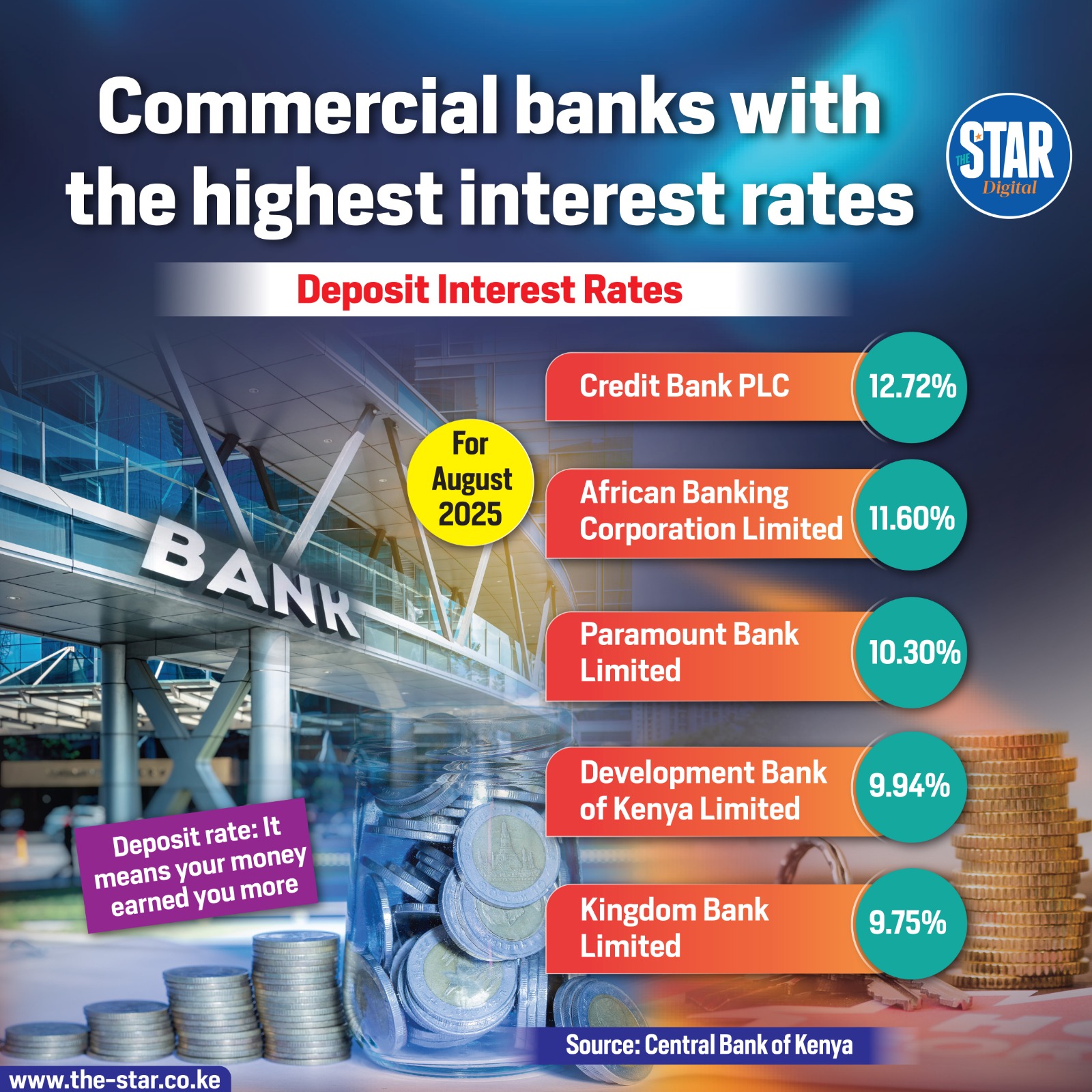 Credit Bank PLC offered the most attractive deposit interest rate in Kenya for August 2025 at 12.72%, positioning itself as a top choice for savers seeking strong returns.