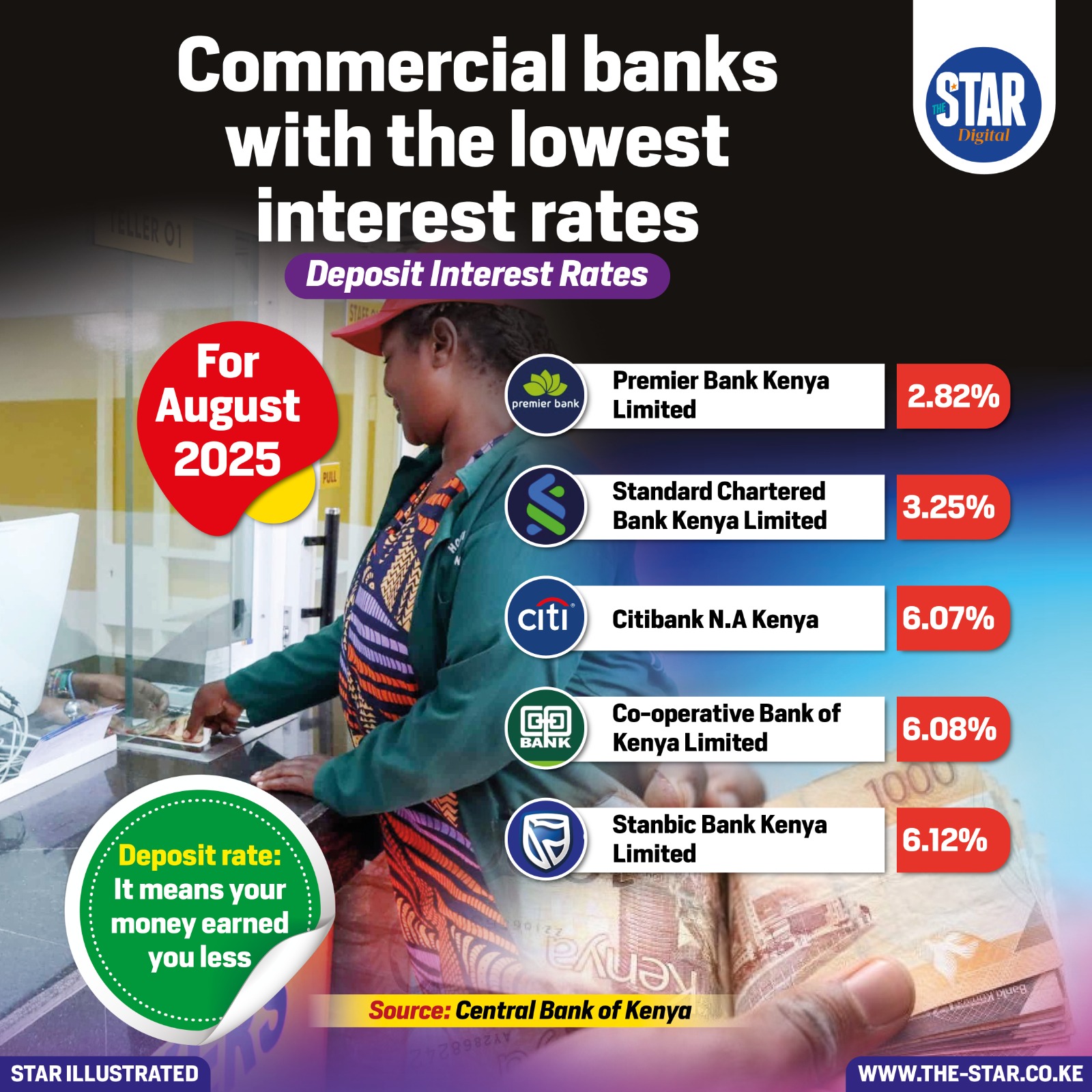 For August 2025, data from the Central Bank of Kenya shows that several commercial banks offered the lowest deposit interest rates, meaning savers earned less on their money.