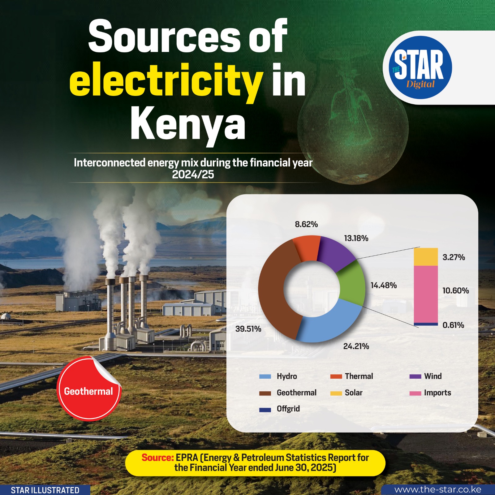 In the financial year 2024/25, Geothermal energy was by far the largest single source of electricity in Kenya's interconnected energy mix, supplying a dominant 39.51% of the total power.