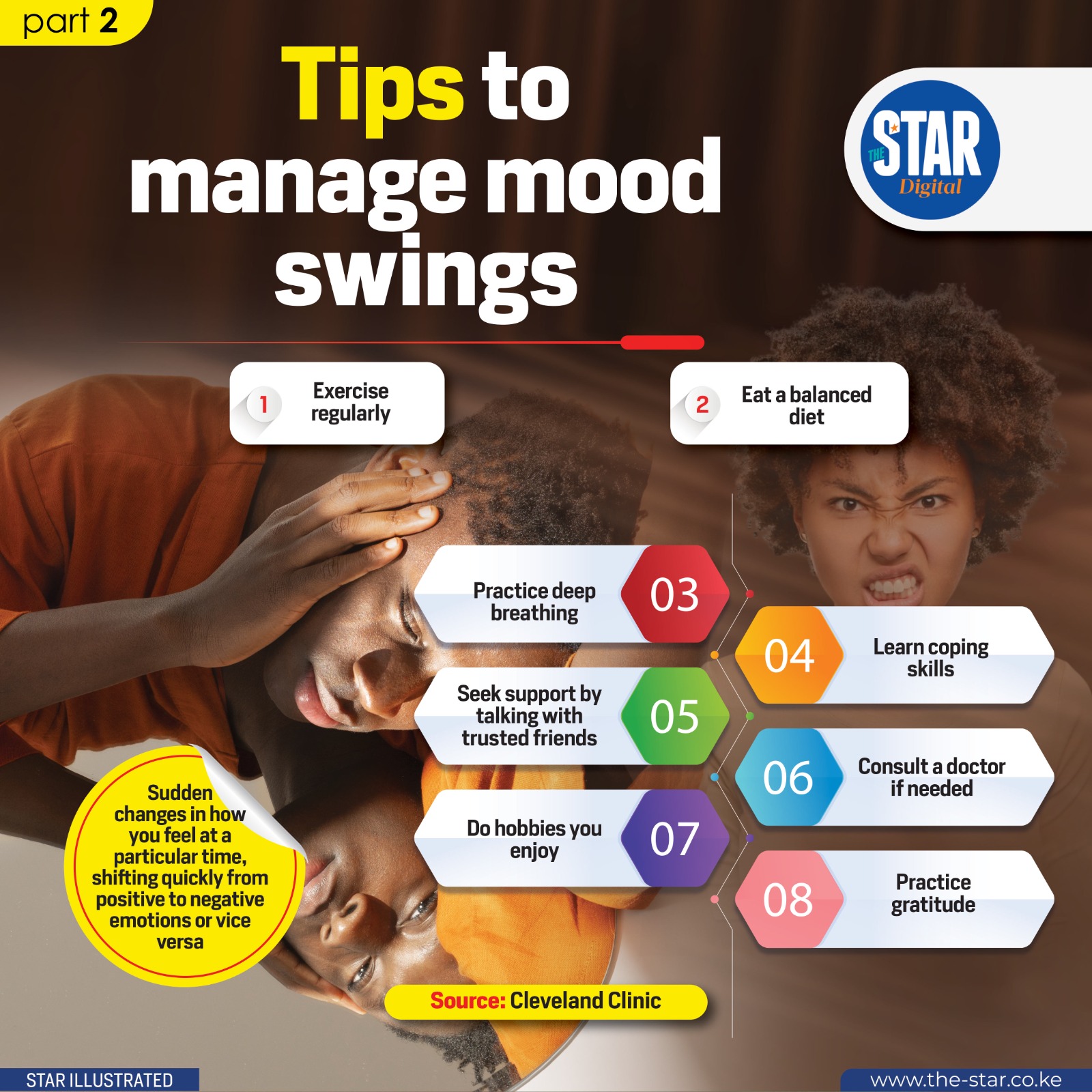 To manage mood swings, exercise regularly, eat balanced meals, practice deep breathing, and engage in enjoyable hobbies.