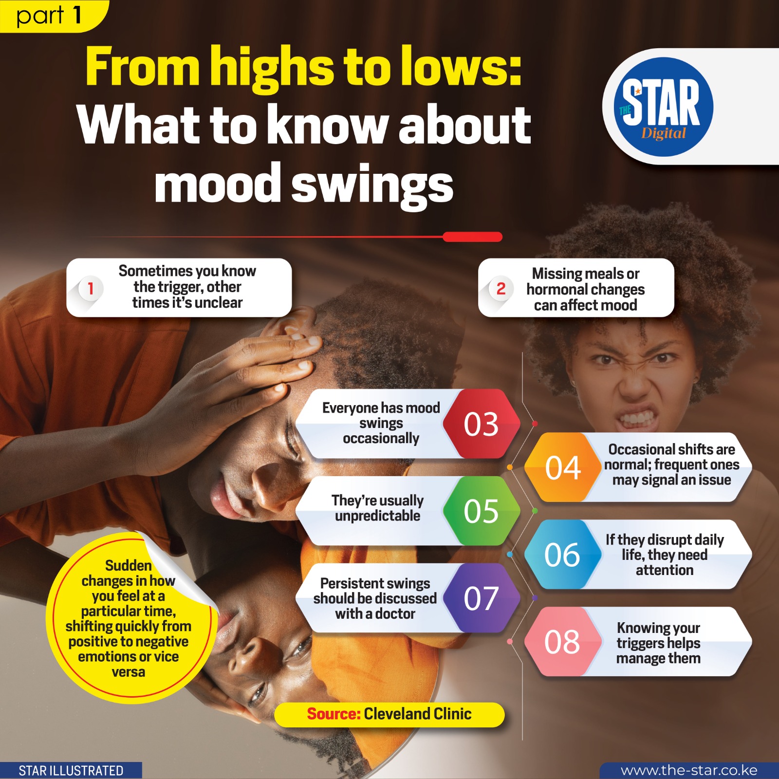 Mood swings involve sudden changes in how you feel at a particular time, shifting quickly from positive to negative emotions or vice versa.