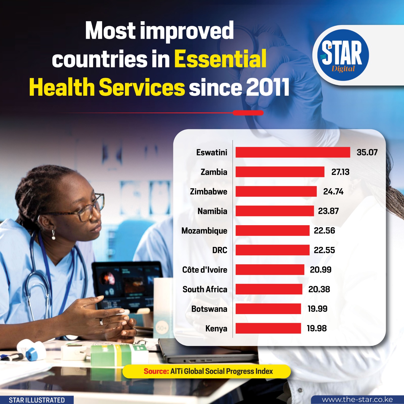 Kenya is among the top 10 most improved, increasing its Essential Health Services score by 19.98 points since 2011.