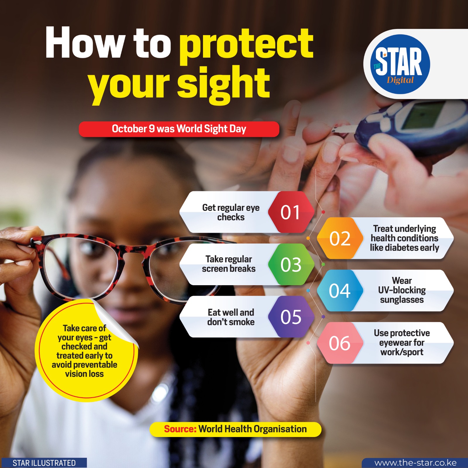 The World Health Organization (WHO) advises regular eye check-ups as the first step in protecting eyesight. Early detection of conditions such as cataracts, glaucoma, and diabetic retinopathy can prevent vision loss.
