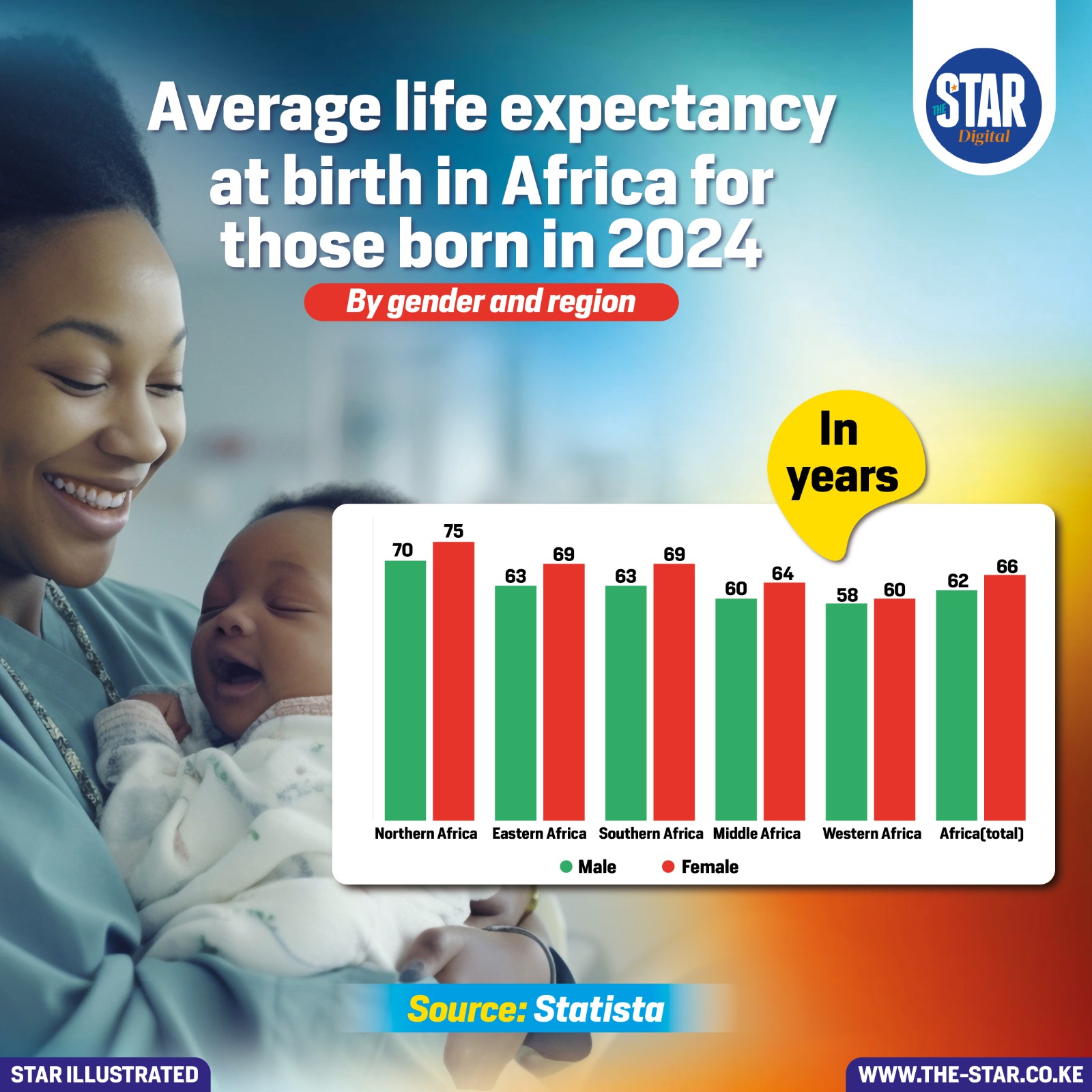 The average life expectancy at birth in Africa for those born in 2024 is estimated to be 62 years for males and 66 years for females, reflecting a continent-wide trend where women tend to live longer than men.