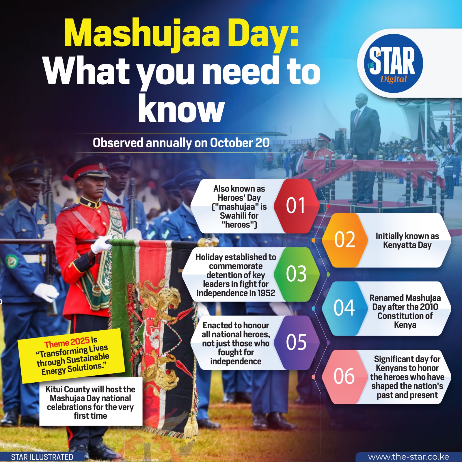 Kenyans will on Sunday, October 20, 2025, mark Mashujaa Day, a national holiday honouring heroes who contributed to the country’s freedom and development. The main celebrations will be held at Ithookwe Stadium in Kitui County, presided over by President William Ruto.