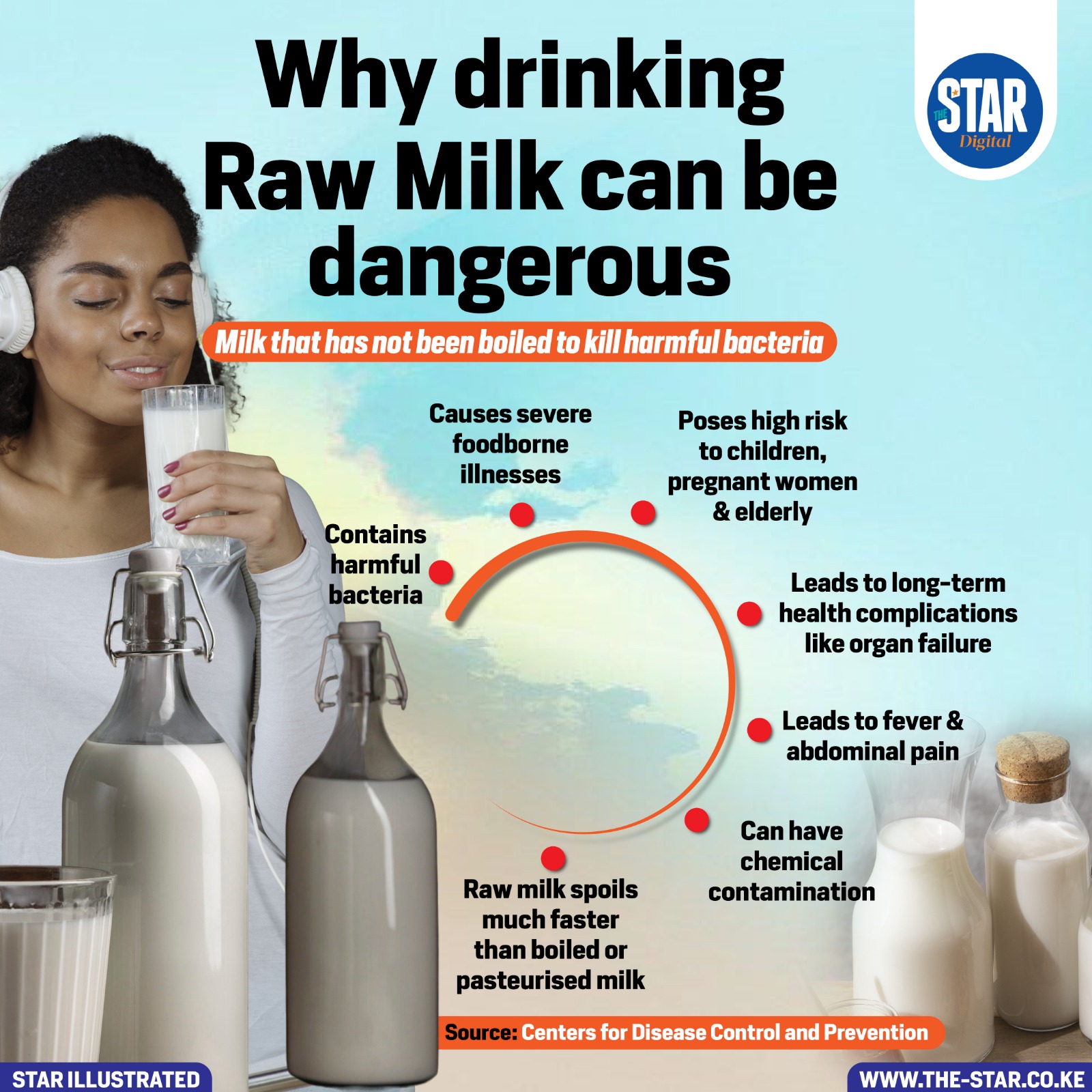 Drinking raw milk poses serious health risks because it can contain harmful bacteria such as Salmonella, E. coli, Listeria and Campylobacter.