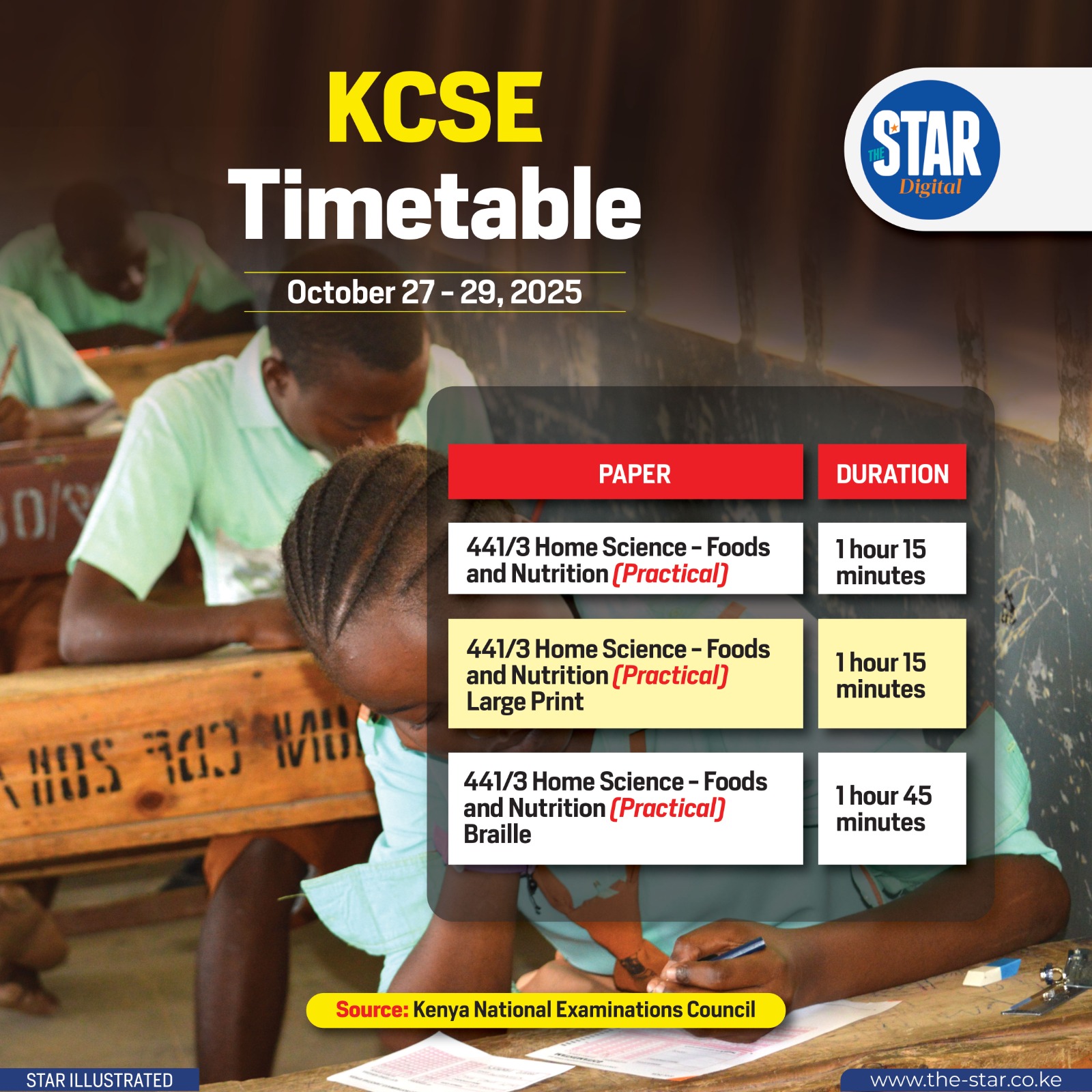 The 2025 Kenya Certificate of Secondary Education (KCSE) examinations continue this week with candidates sitting for the Home Science practical paper between October 27 and 29.