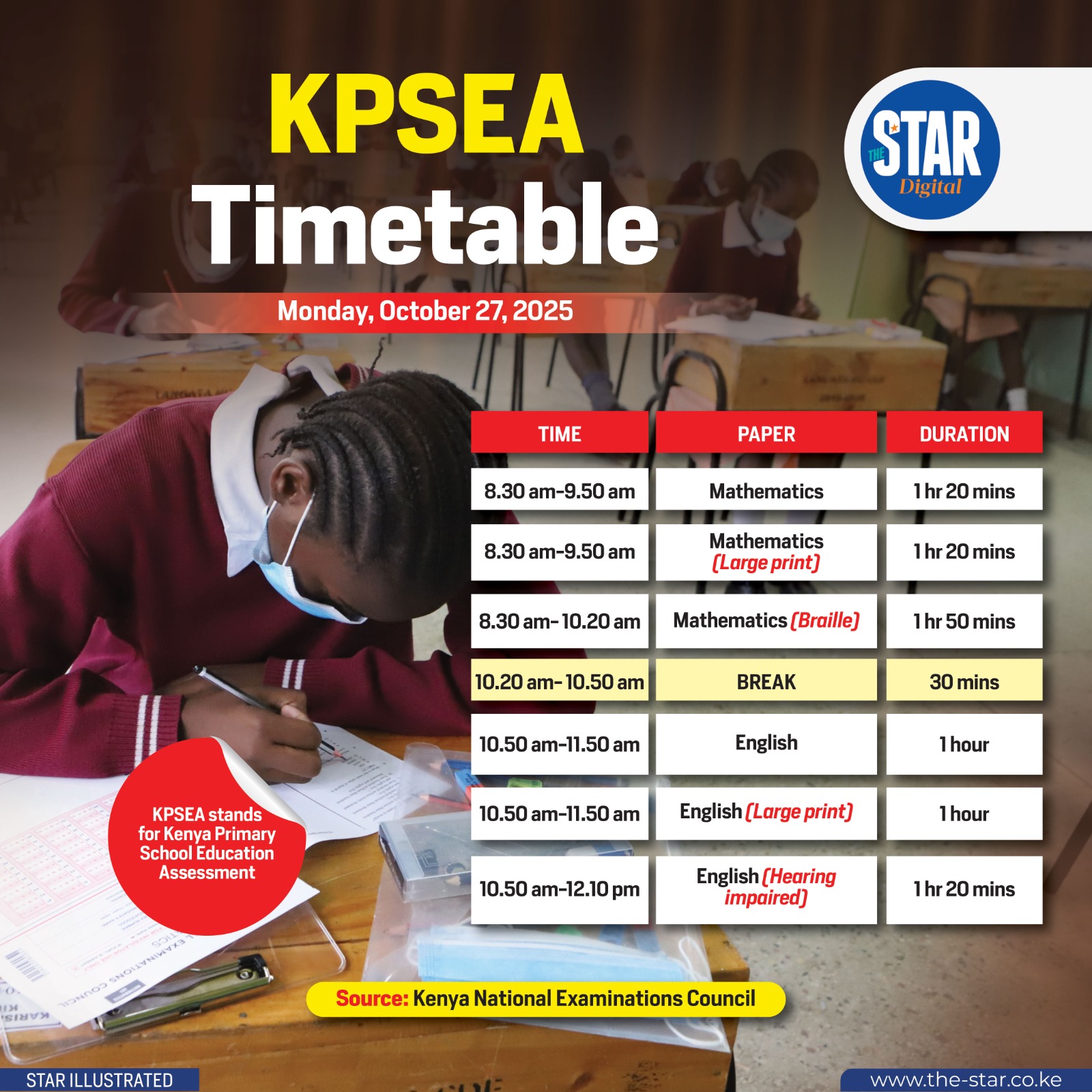 The 2025 KPSEA examination timetable begins with Mathematics and English on Monday, October 27, 2025.