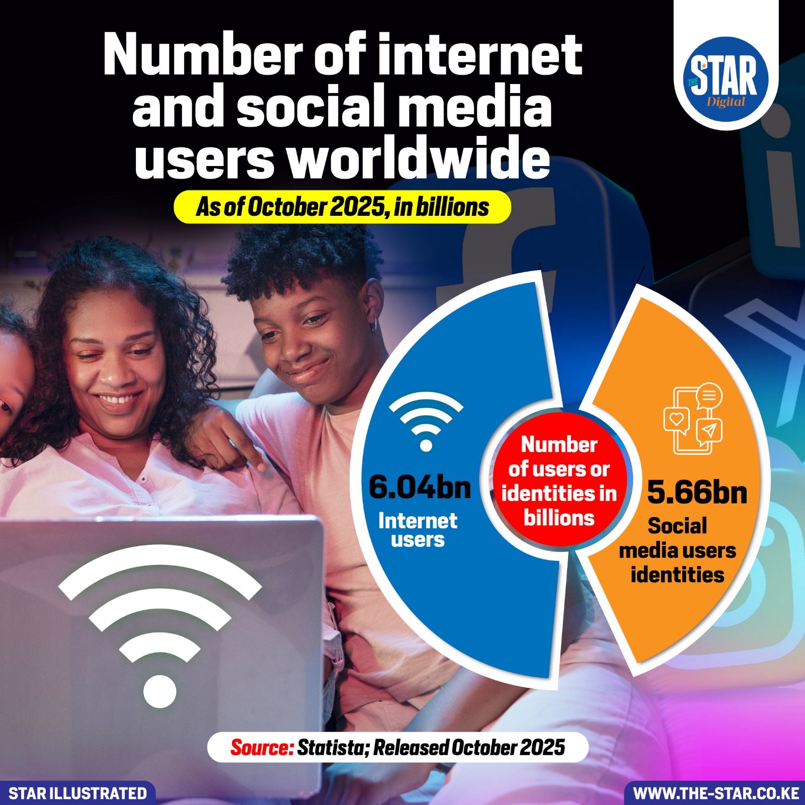 As of October 2025, the number of internet users worldwide stands at 6.04 billion, while social media user identities total 5.66 billion.