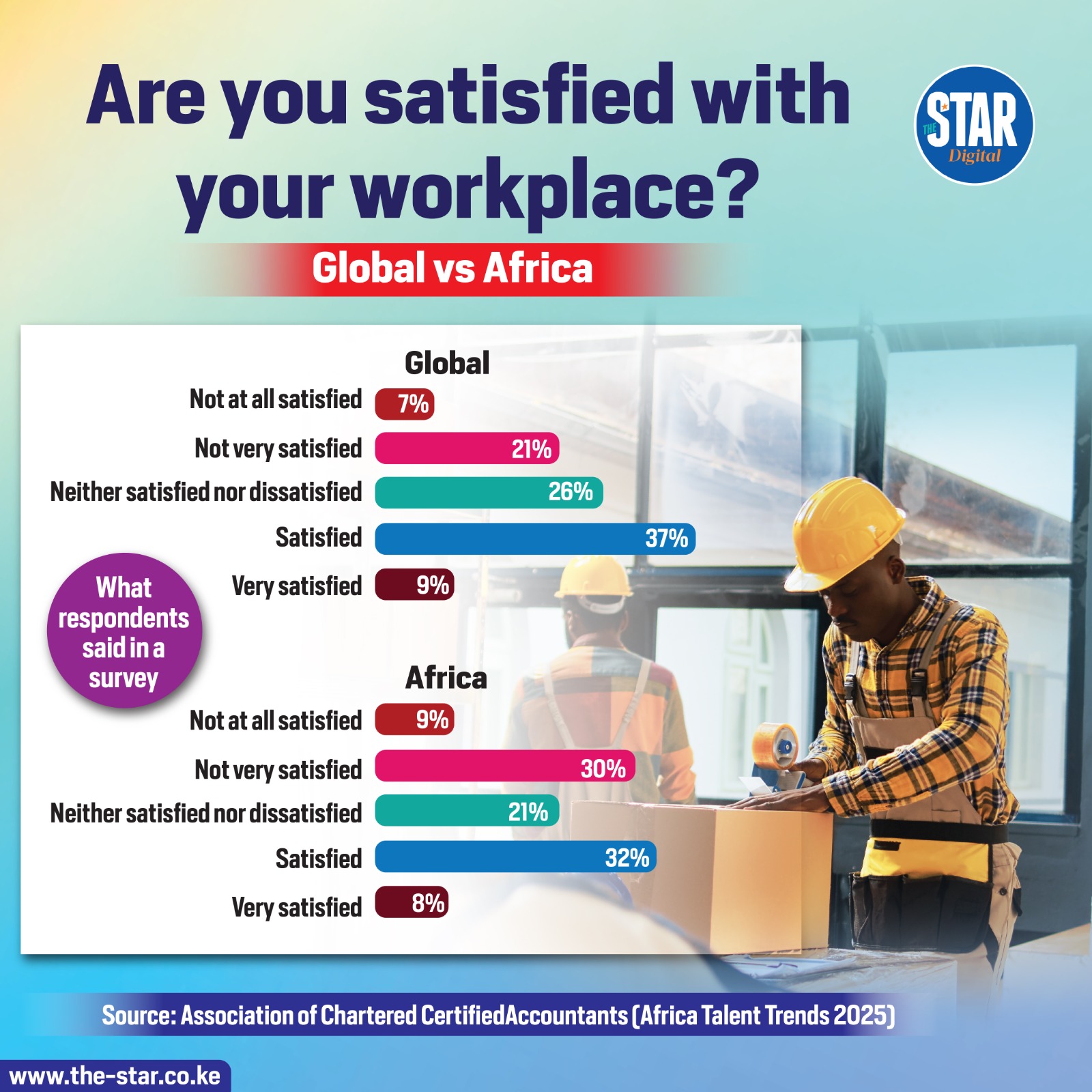 A survey by the Association of Chartered Certified Accountants (Africa Talent Trends 2025) shows varying levels of workplace satisfaction globally and in Africa.