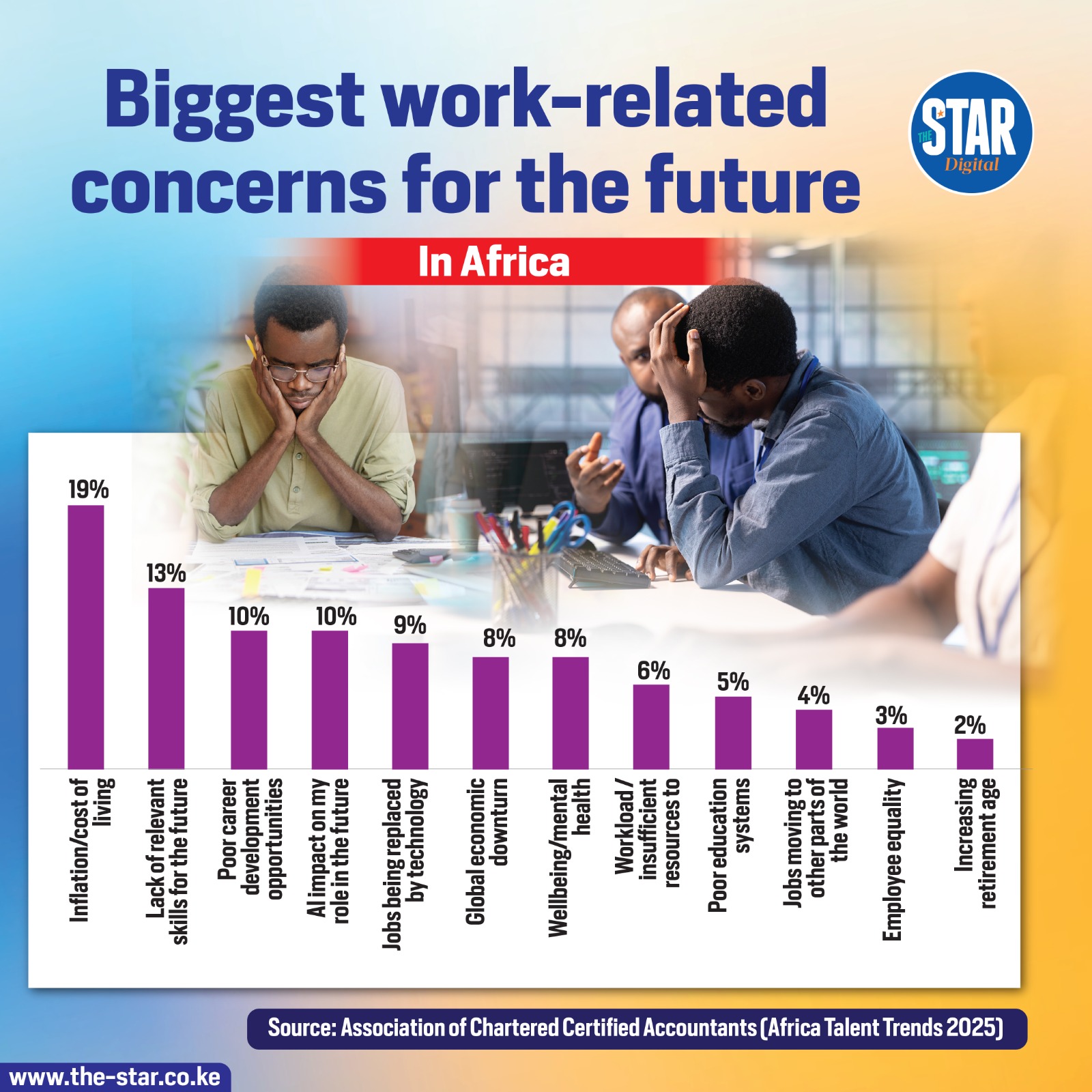 Inflation and cost of living top the list of future work-related concerns in Africa, with 19% of respondents citing it as their biggest worry.