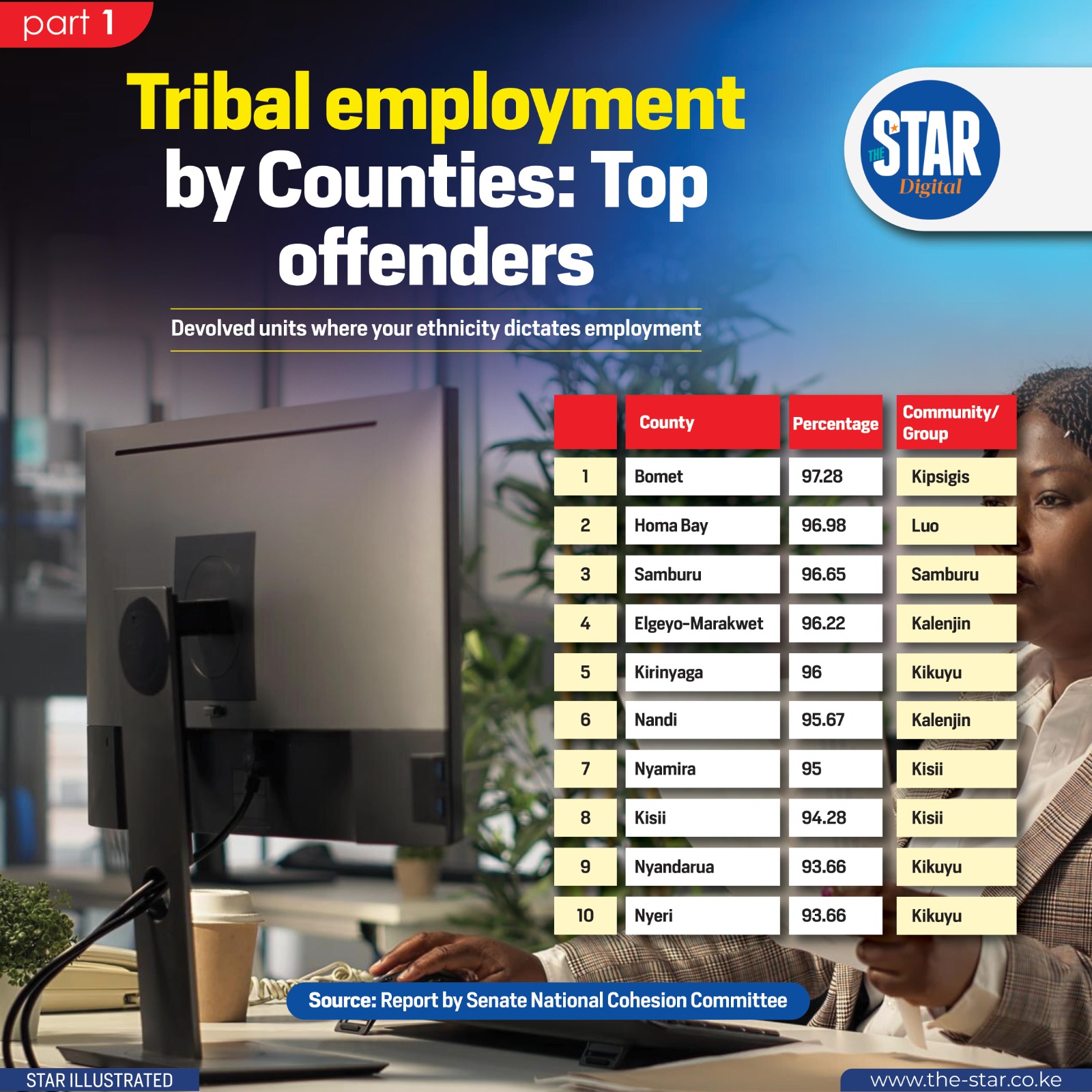 Kenya’s county employment data reveals high concentrations of single ethnic groups within public service ranks. In Bomet, 97.28% of employees are Kipsigis, while Homa Bay records 96.98% Luo representation.
