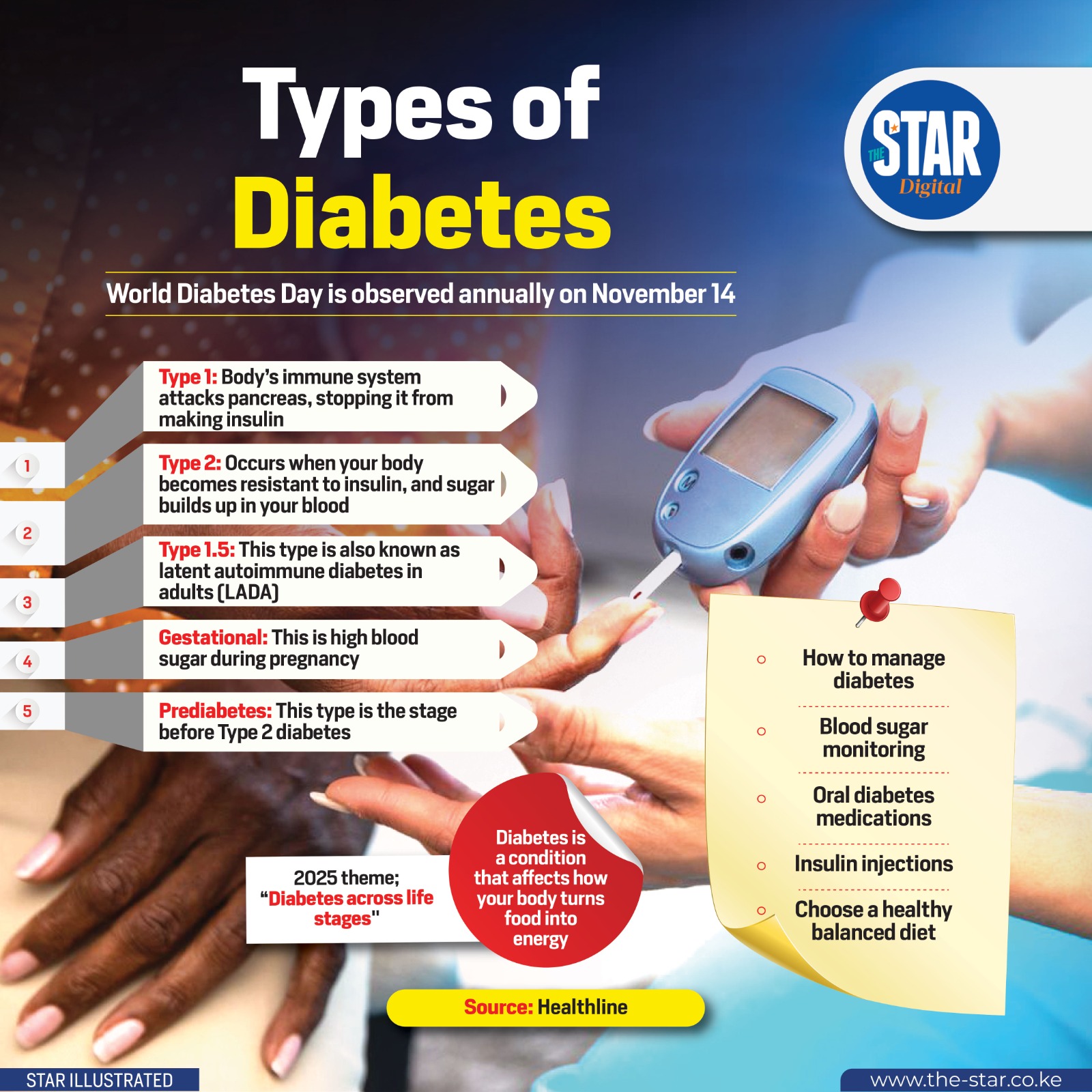 There are several types: Type 1, where the immune system attacks the pancreas, stopping insulin production; Type 2, caused by insulin resistance leading to high blood sugar; Type 1.5 (LADA), a slower-onset autoimmune form in adults; Gestational, high blood sugar during pregnancy; and Prediabetes, the stage before Type 2.