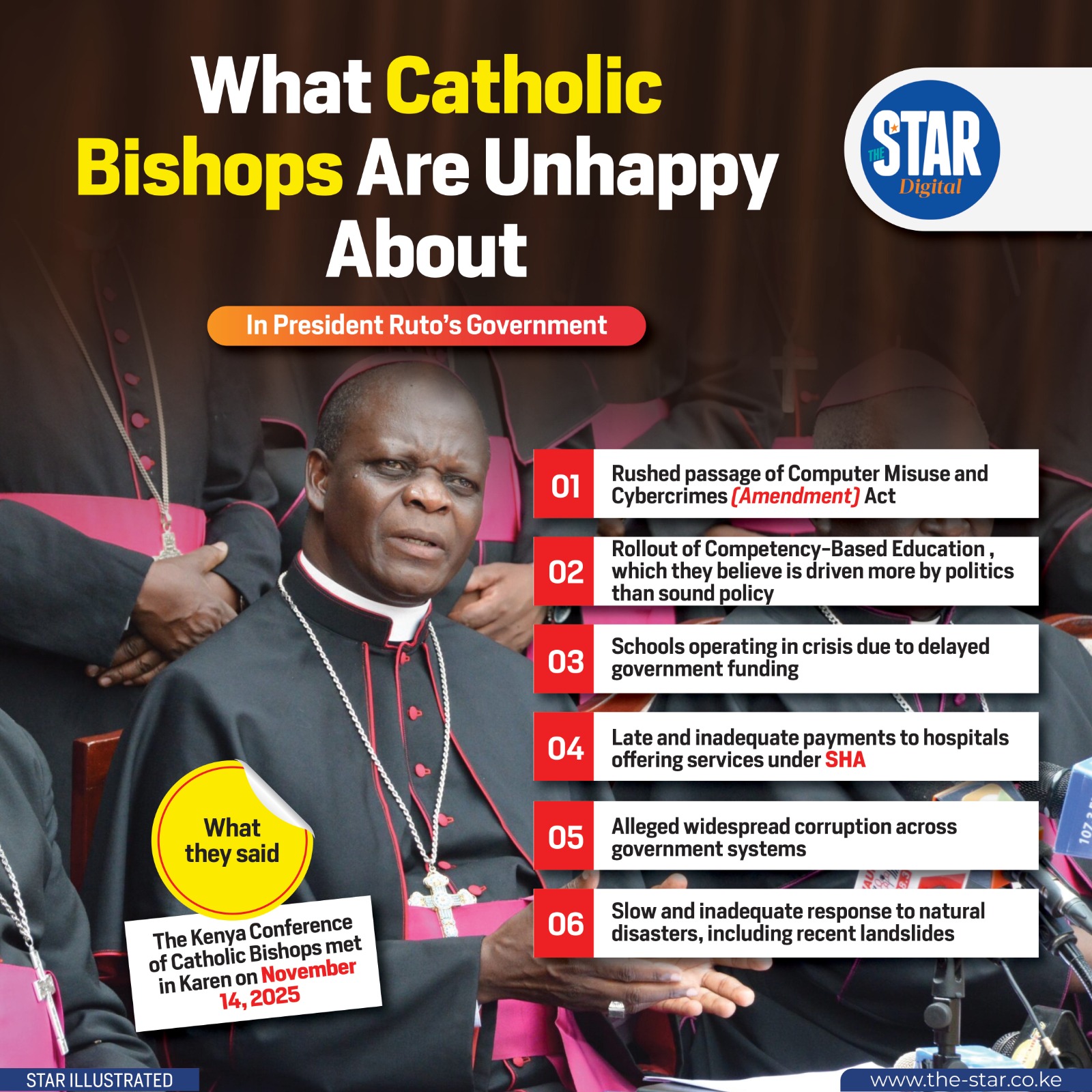 The Kenya Conference of Catholic Bishops, following a meeting in Karen on November 14, 2025, expressed significant displeasure with President Ruto's government on several key issues. Their concerns span legislative action, education, healthcare, and governance.