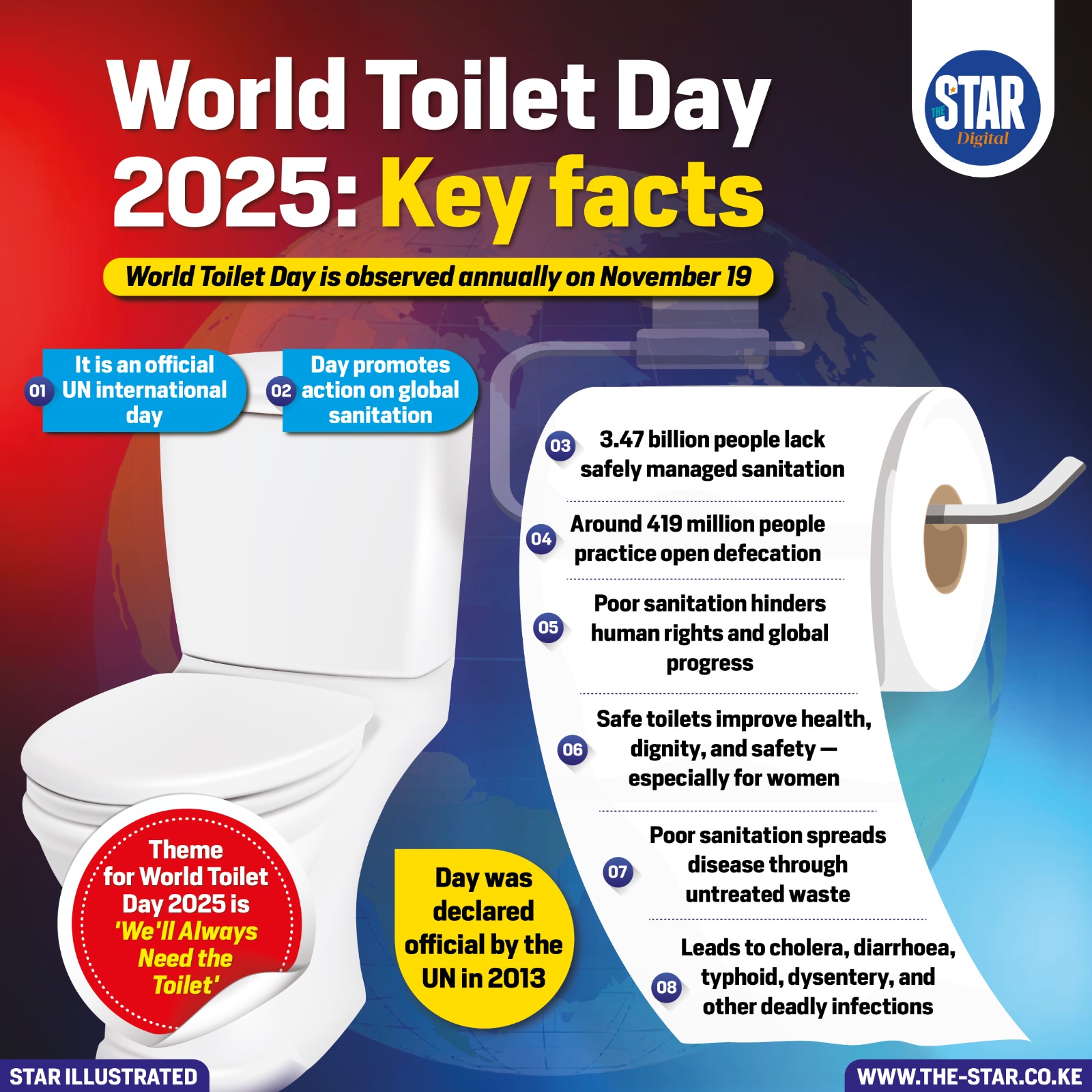 Prior to that, World Toilet Day had been established unofficially by the World Toilet Organisation (a Singapore-based NGO) in 2001. UN-Water is the official convener of World Toilet Day.
