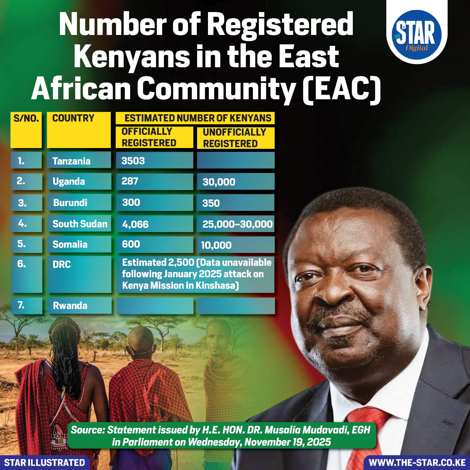 A statement by Prime CS Musalia Mudavadi, presented in Parliament on November 19, 2025, revealed the estimated number of Kenyans registered across East African Community (EAC) countries.