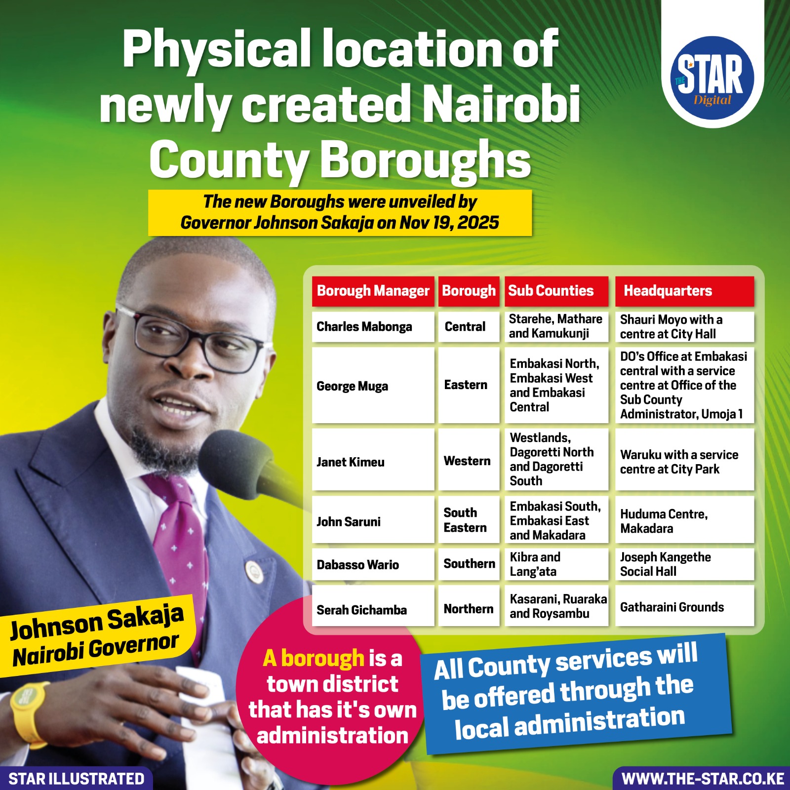 Physical location of newly created Nairobi county boroughsEach borough, managed by a Borough Manager, will have its own budget and development plan.