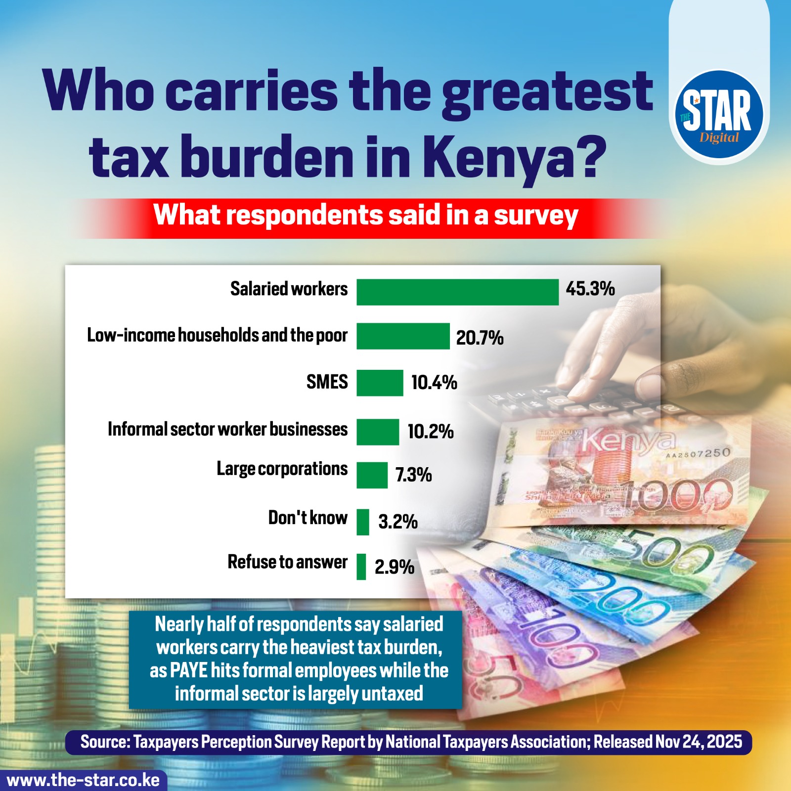 Salaried workers are perceived to bear the greatest share of Kenya’s tax burden, with 45.3% of respondents identifying them as the most affected group.