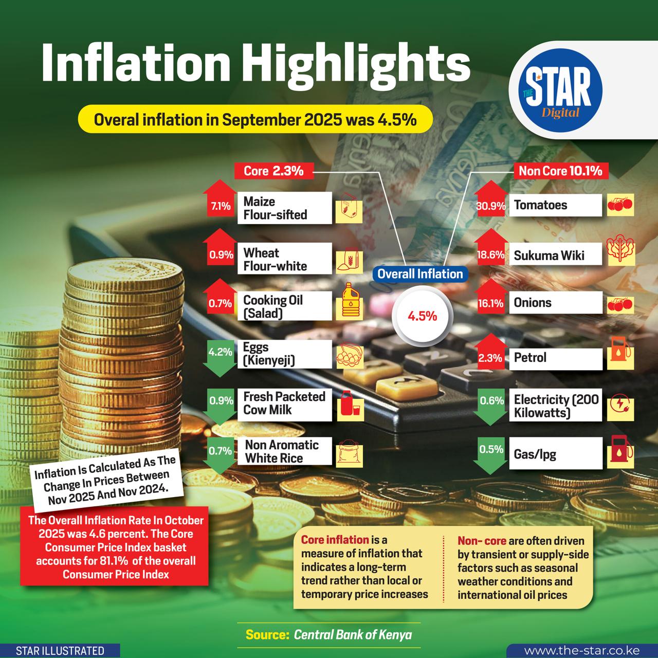 Kenya's inflation rate was 4.5 per cent in September 2025 and 4.6 per cent in October, staying below the central bank's 5 per cent target.