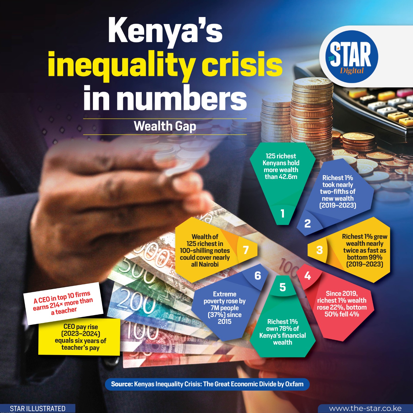 Today, the top 1 per cent controls 78 per cent of Kenya’s financial wealth, reflecting an imbalance that continues to widen. This inequality is mirrored in income disparities, where a CEO in Kenya’s top companies earns 214 times more than a teacher, and the CEO's pay rise from 2023 to 2024 alone equals six years of a teacher’s earnings.
