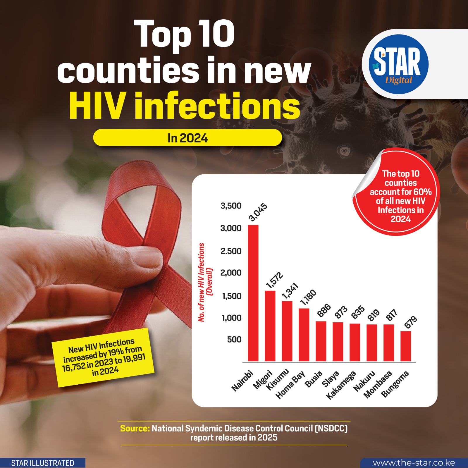 Migori followed with 1,572 new infections, while Kisumu reported 1,341, highlighting the continued burden of HIV in western Kenya.