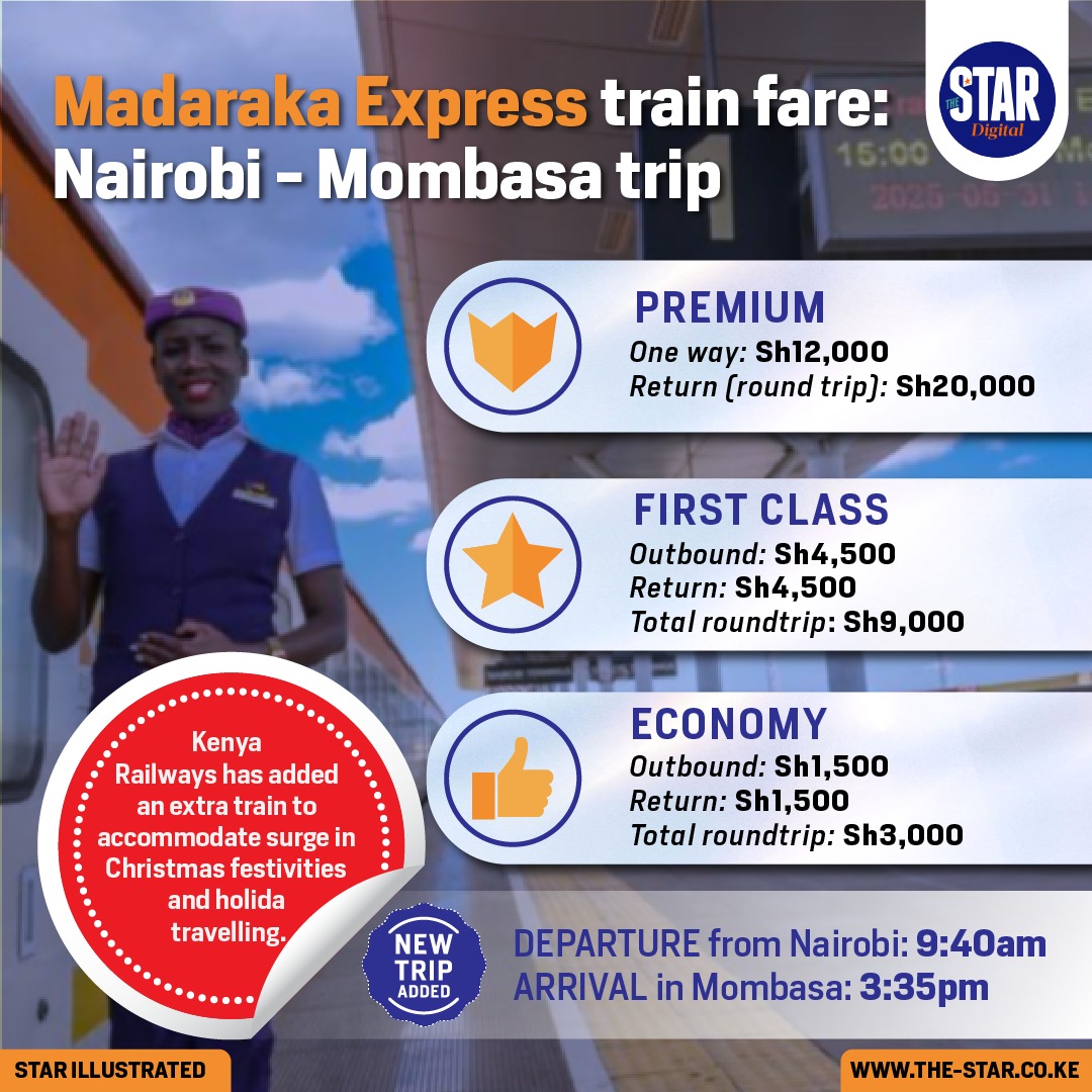 Travelling between Nairobi and Mombasa on the Madaraka Express offers three distinct fare classes, with a new trip added to accommodate the surge in Christmas and holiday travel.