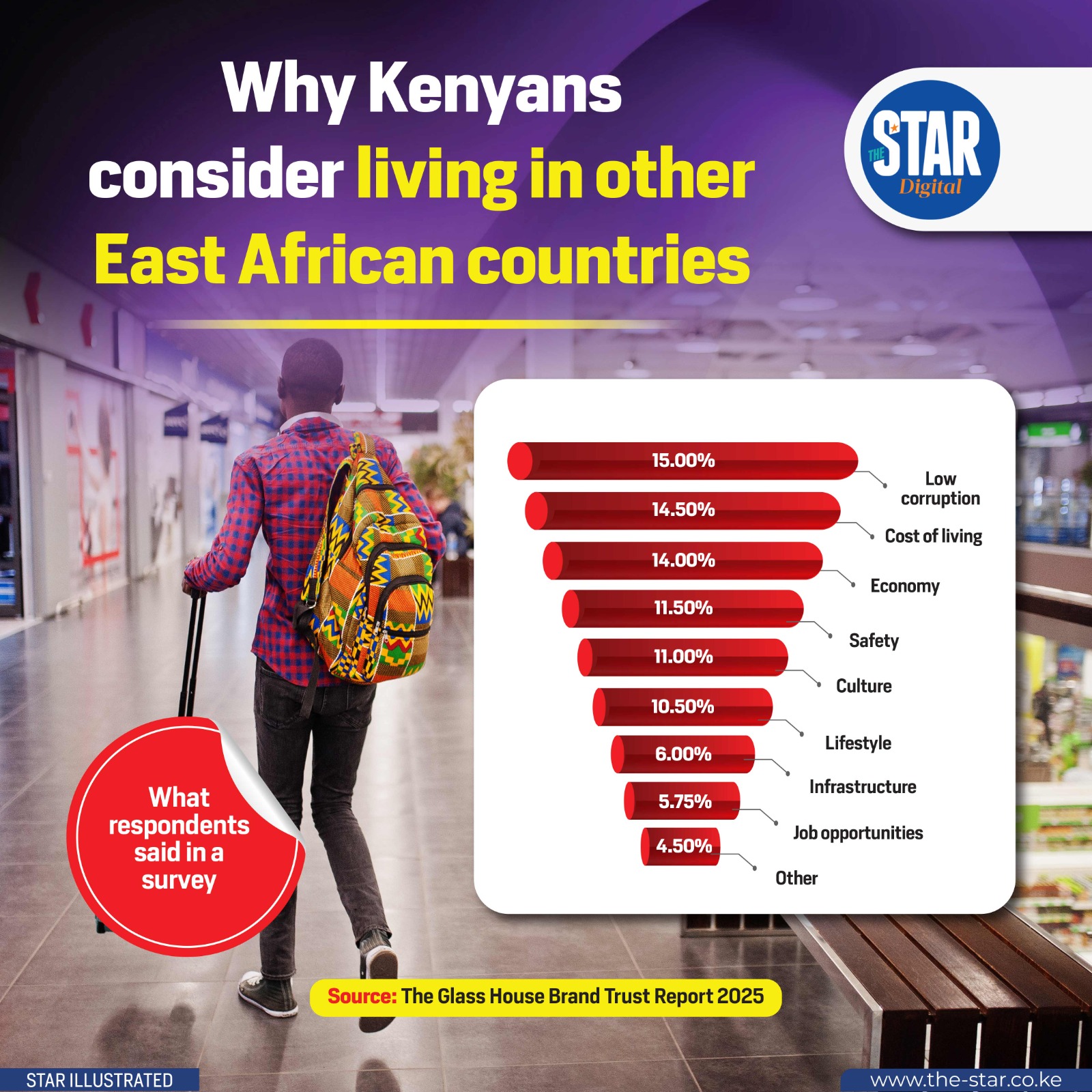 Economic factors are also major motivators, with the Cost of living being the second-highest concern at 14.50%, followed closely by the general state of the Economy at 14.00%. This suggests that many Kenyans believe they could achieve a better quality of life and financial stability elsewhere in the region.