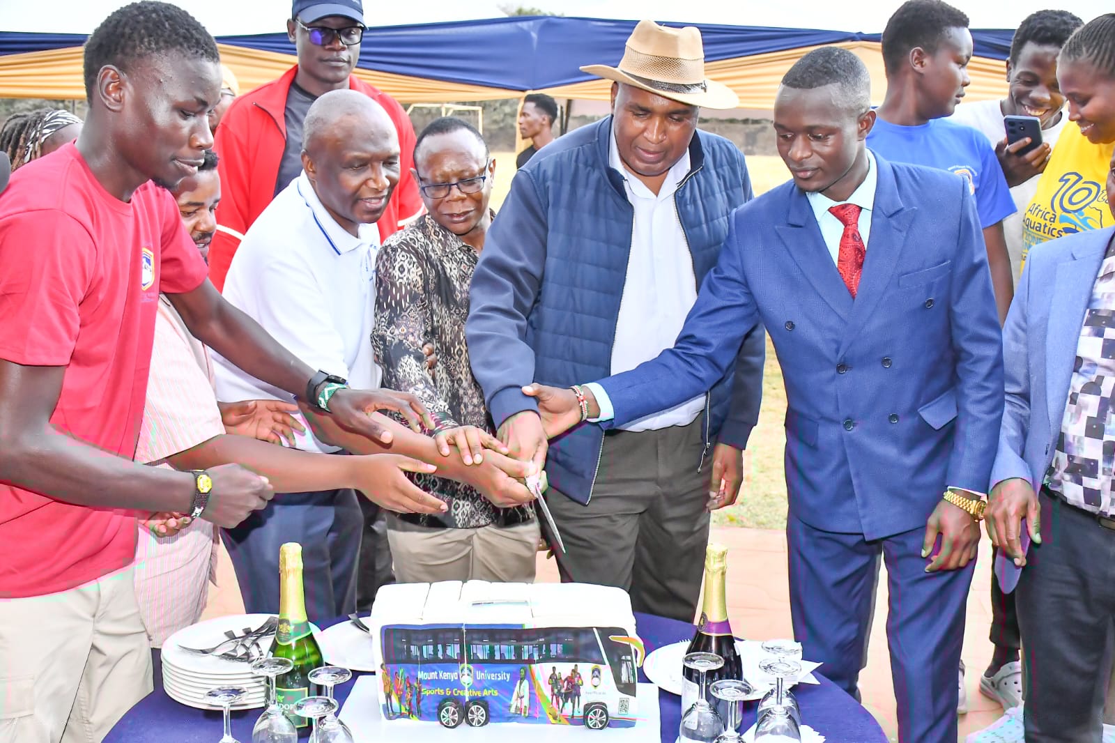Mount Kenya University Chairman and Founder, Prof. Simon Gicharu, cuts the cake alongside Vice-Chancellor, Prof. Deogratius Jaganyi, and students after handing over a Scania bus and sports equipment — an initiative aimed at enhancing sports and creative arts development at the University/JOHN MUCHUCHAThe event marked a significant milestone in Mount Kenya University’s ongoing efforts to nurture talent and inspire excellence in sports and creative arts, reaffirming its position as one of Kenya’s leading institutions committed to holistic education.