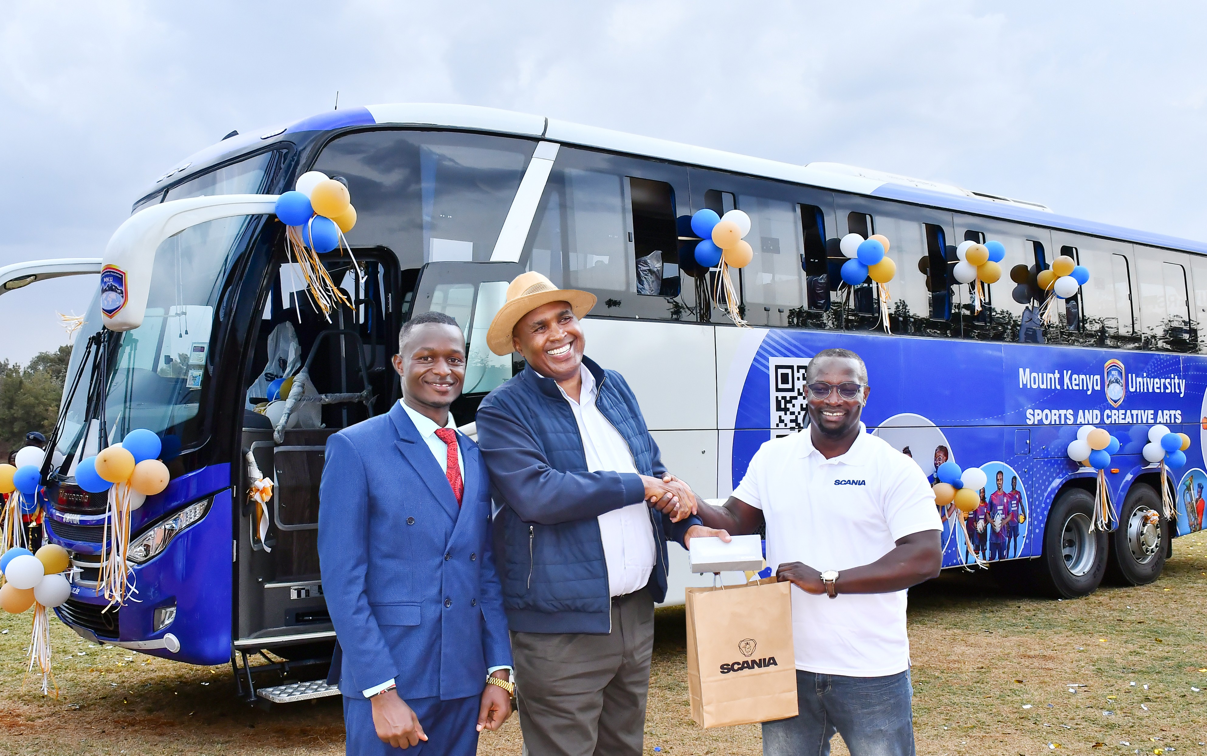 Mount Kenya University Chairman and Founder, Prof. Simon Gicharu, hands over a Scania Marcopolo bus and equipment to Vice-Chancellor, Prof. Deogratius Jaganyi. The bus, presented as a gift by Nelson Jeremy, Sales Manager at Scania Marcopolo (right), was received in the presence of MkU students. The new acquisition is set to ease movement for students pursuing sports and creative arts at the University. PHOTO JOHN MUCHUCHAThe new Scania Marcopolo bus is expected to transform the logistical experience for MKU’s sports and creative arts teams, offering comfortable and efficient travel.
