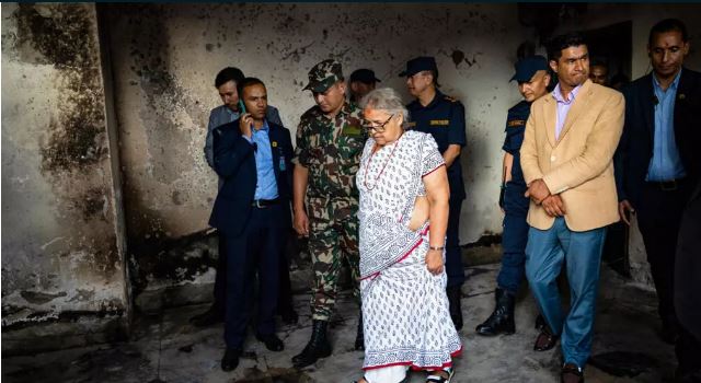 Nepal's interim leader Sushila Karki (C), inspecting a torched police station./SCREENGRAB
