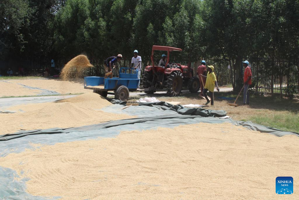 Local farmers dry and clean harvested rice at the base of the Agricultural Technical Assistance Mission of China to Chad in Midekin Village of Hadjer-Lamis Region, Chad, on Oct. 4, 2025. (Photo by Arnaud Mbaigolmem/Xinhua)