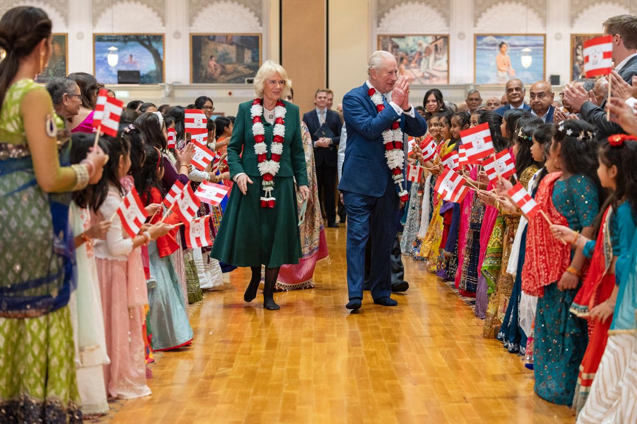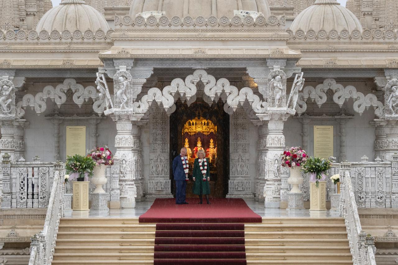 King Charles and Queen Camilla were received by Jitu Patel, Chair of the Board of Trustees, and other senior representatives of the Temple.