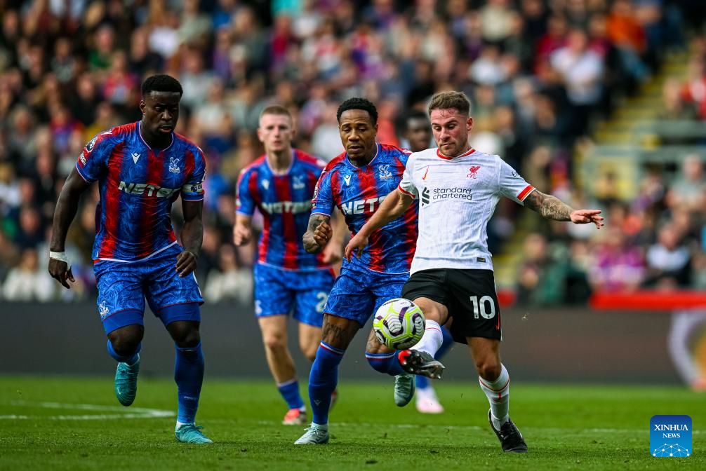 [ FILE PHOTO] Liverpool's Alexis Mac Allister (1st R) vies for the ball during the English Premier League match between Liverpool and Crystal Palace in London, Britain, on Oct. 5, 2024. (Xinhua)