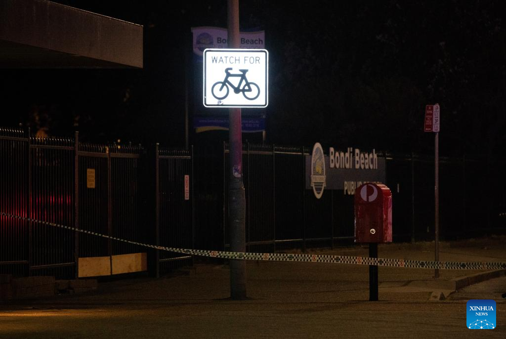 An area is cordoned off near the shooting site at Bondi Beach in Sydney, Australia, on Dec. 14, 2025. At least 12 people have died after a shooting at Sydney's Bondi Beach on Sunday night, said New South Wales Premier Chris Minns.(Xinhua/Ma Ping)