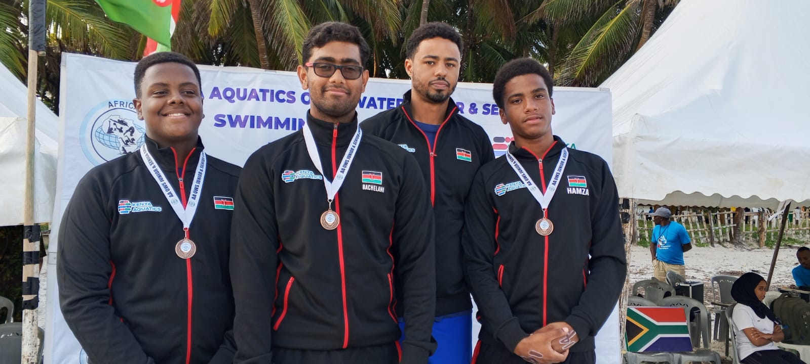 Team Kenya medallits at the African Open water championship in Momabasa Joseph Aryan, Samir Bachelani, Suleiman Mohammed and Joseph Hamaza/HANDOUT Buoyed by a promising performance at last week’s Africa Open Water Swimming Championships in Mombasa, Team Kenya have set their sights on becoming one of the continent’s top contenders in the discipline.