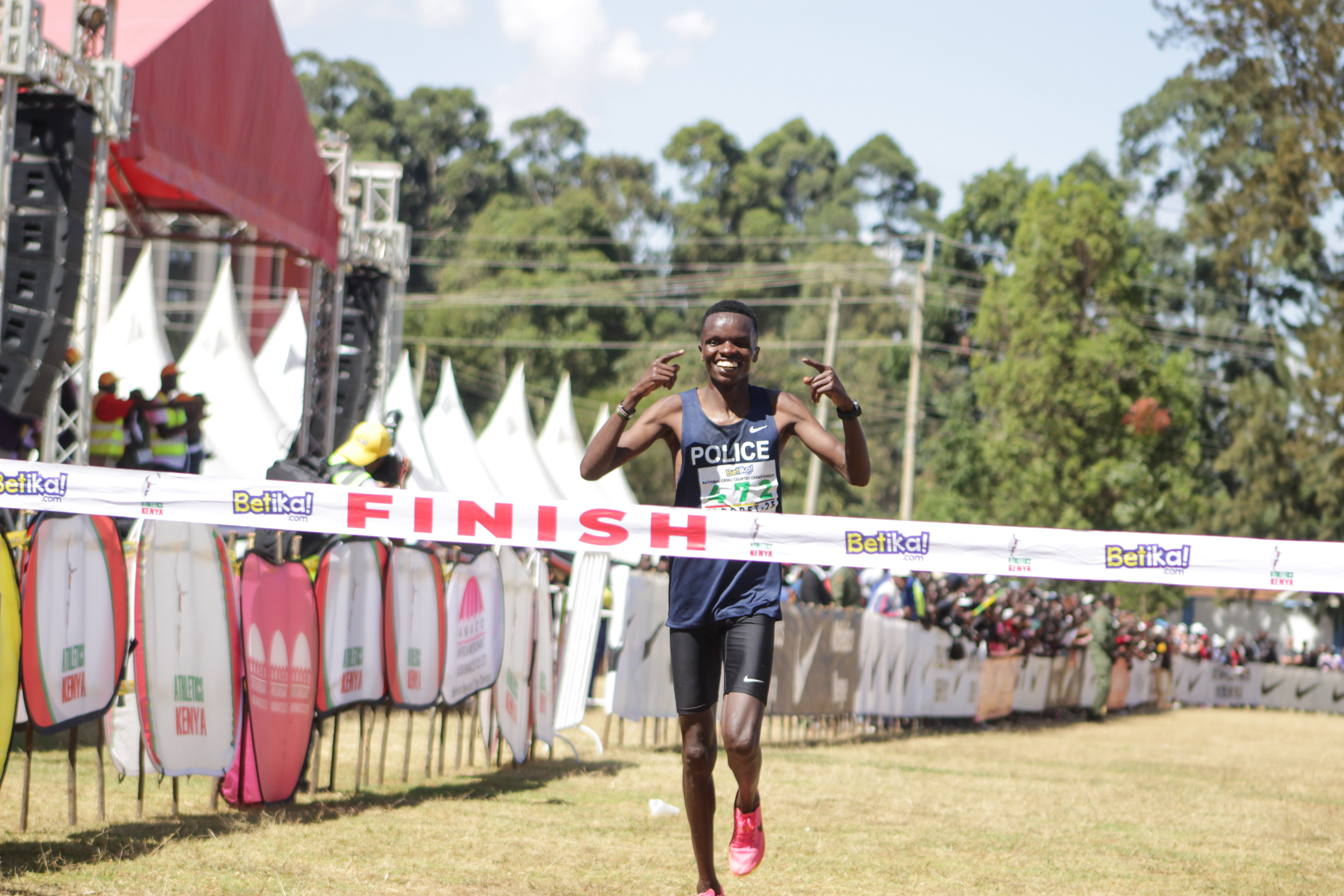 Daniel Simiu celebrates after winning the 2025 national cross country title/TEDDY MULEI