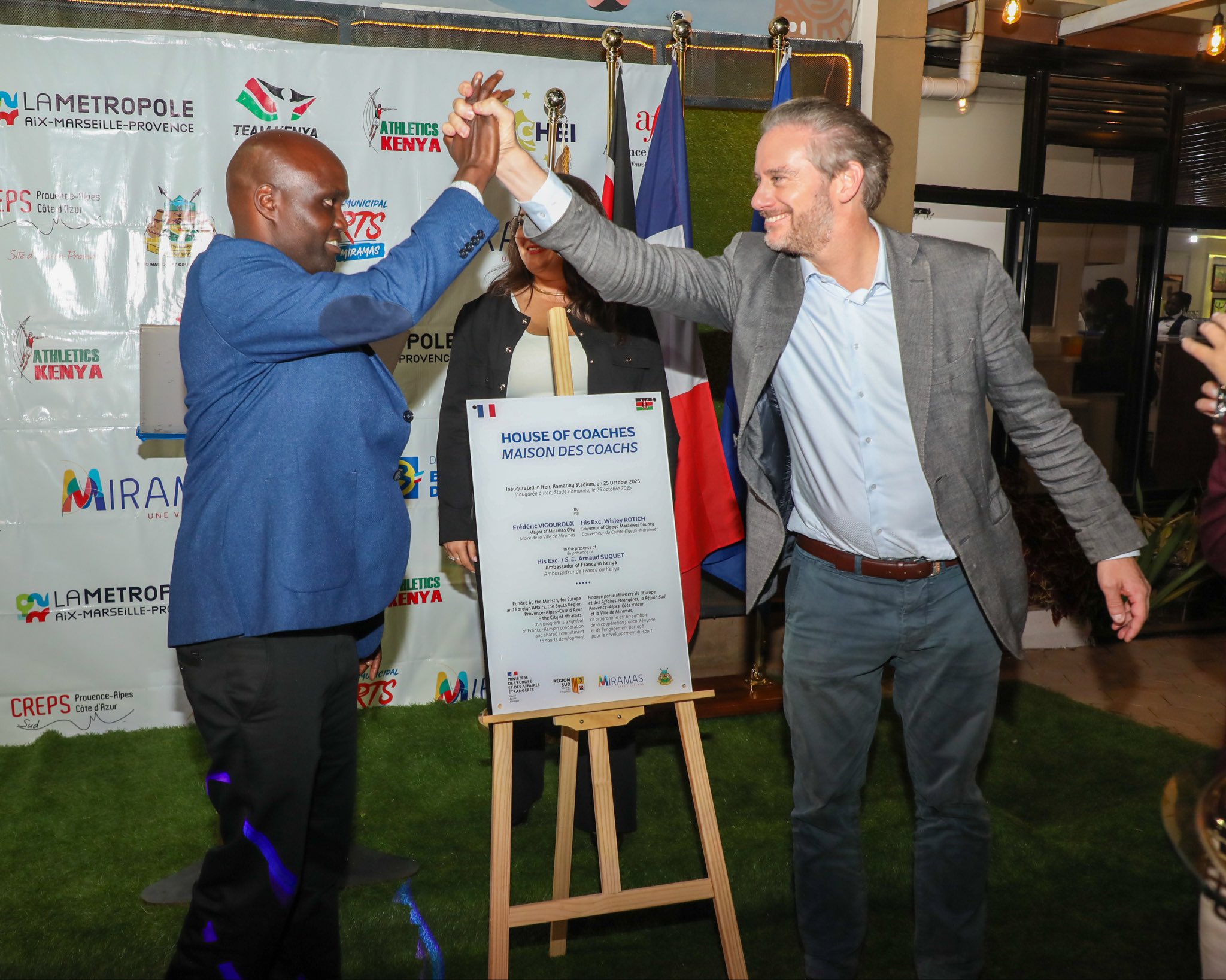 French Ambassador to Kenya Arnaud Suquet and Elgewo Marakwet Governor Wisley Rotich unveil a plaque of the House of Coaches in Iten/CHARLENEMALWAThe partnership between Elgeyo Marakwet County and the French city of Miramas under the House of Coaches project is transforming Kenya’s sports landscape by equipping local coaches with international expertise.