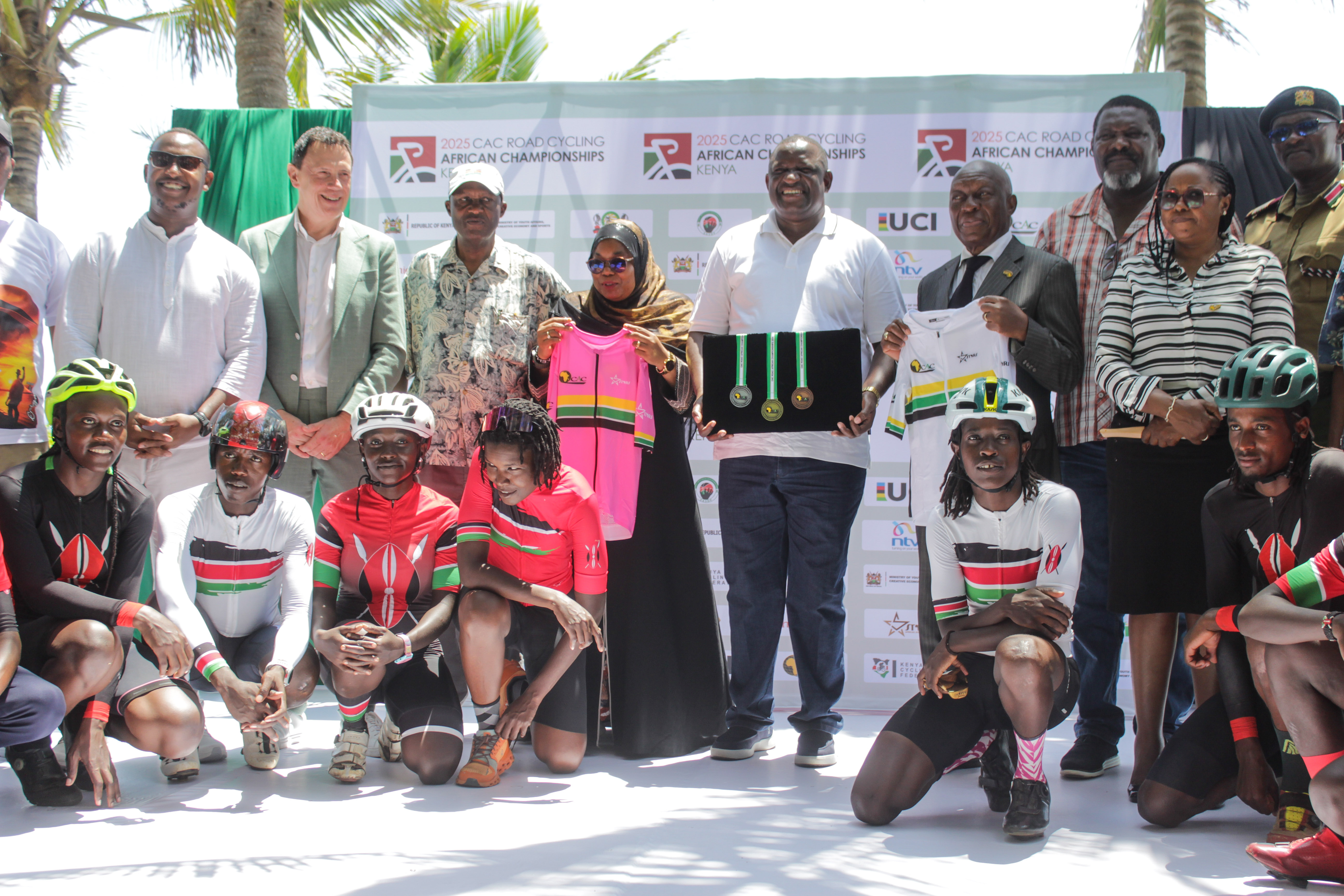 Sports CS Salim Mvurya (C) with Kwale Governor Fatuma Achani (left of Mvurya) and CAC President Yao Allah Kouame (right of Mvurya)/ TEDDY MULEIFollowing dominant displays at the Africa Women’s Cycling Championship in Burundi, Monica Jelimo and Grace Kaviro hope to continue their medal-winning form at the CAC Road Cycling African Championships, which begin today in Diani, Kwale County.